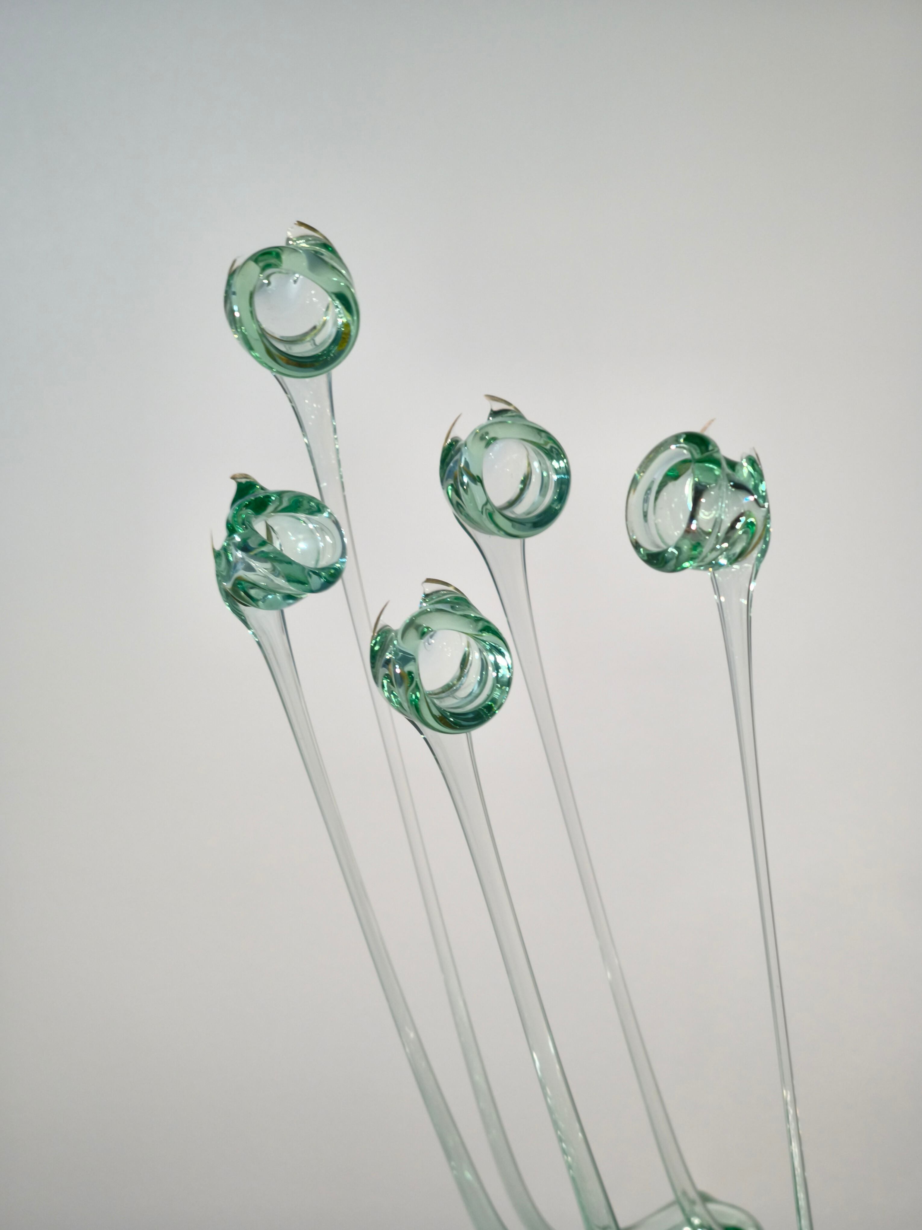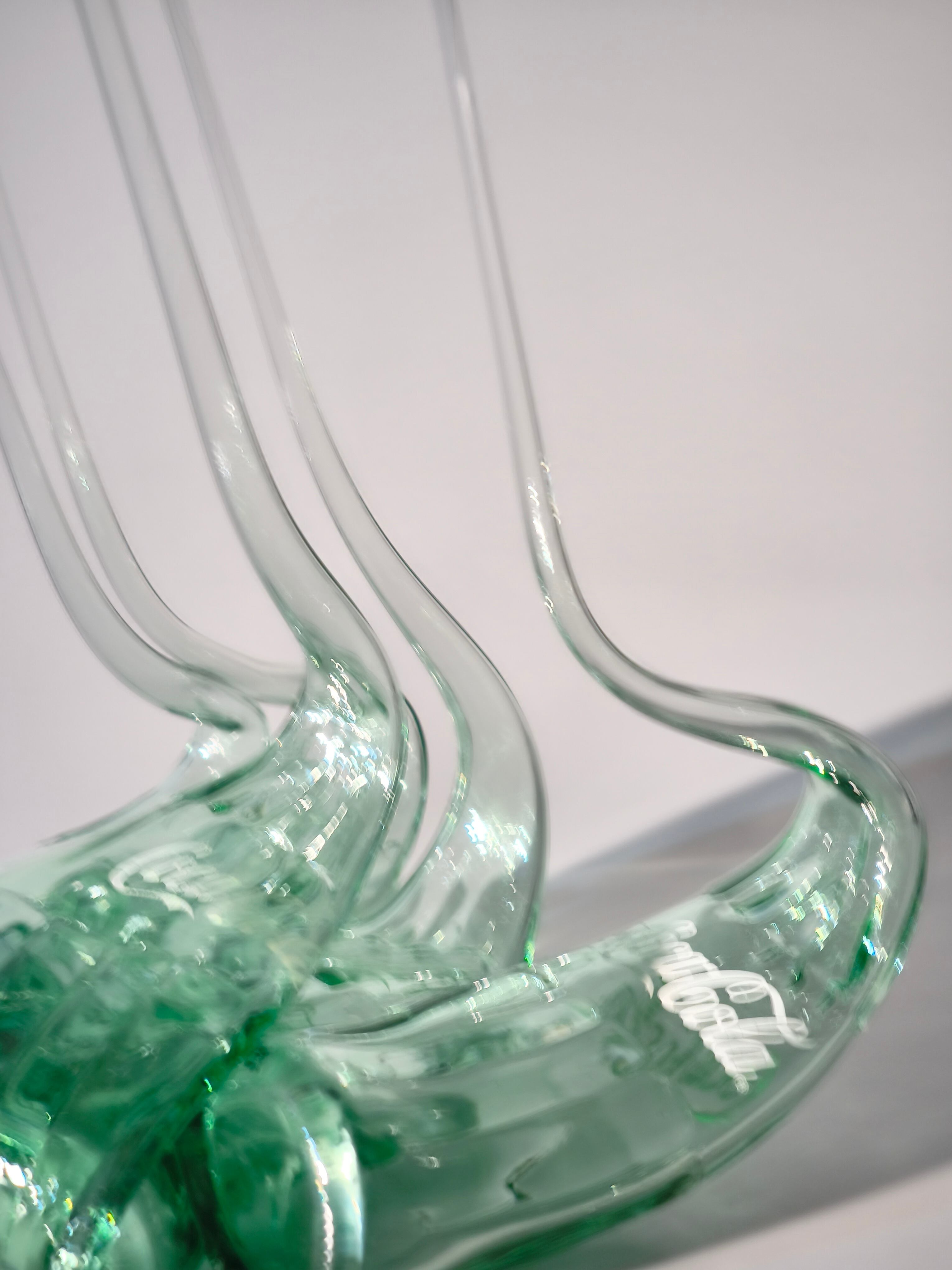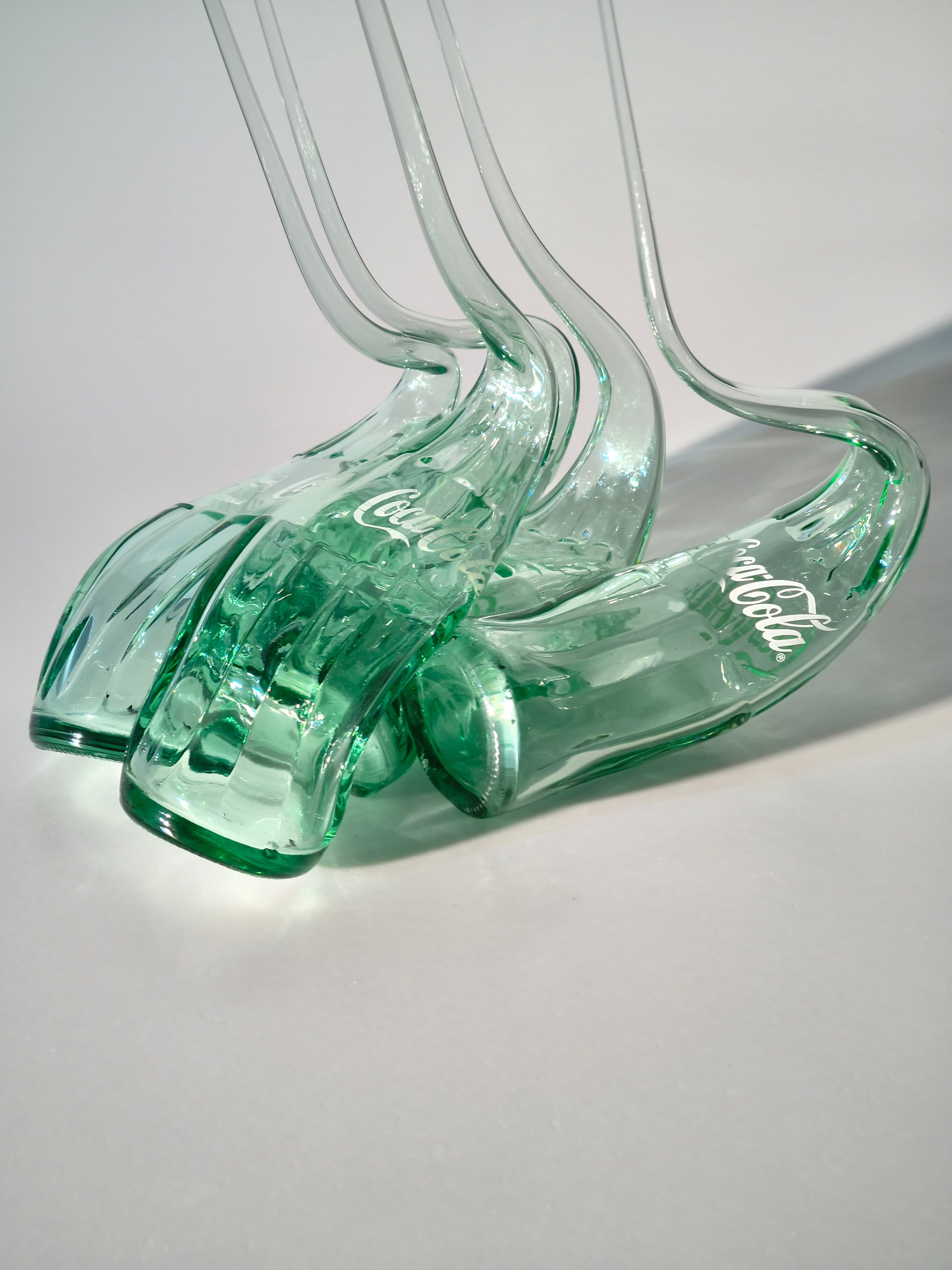 こうして生まれた作品は、ガラス瓶が「瓶」という機能的存在から離れ、 ガラスという素材そのものへと回帰する行為の痕跡である。