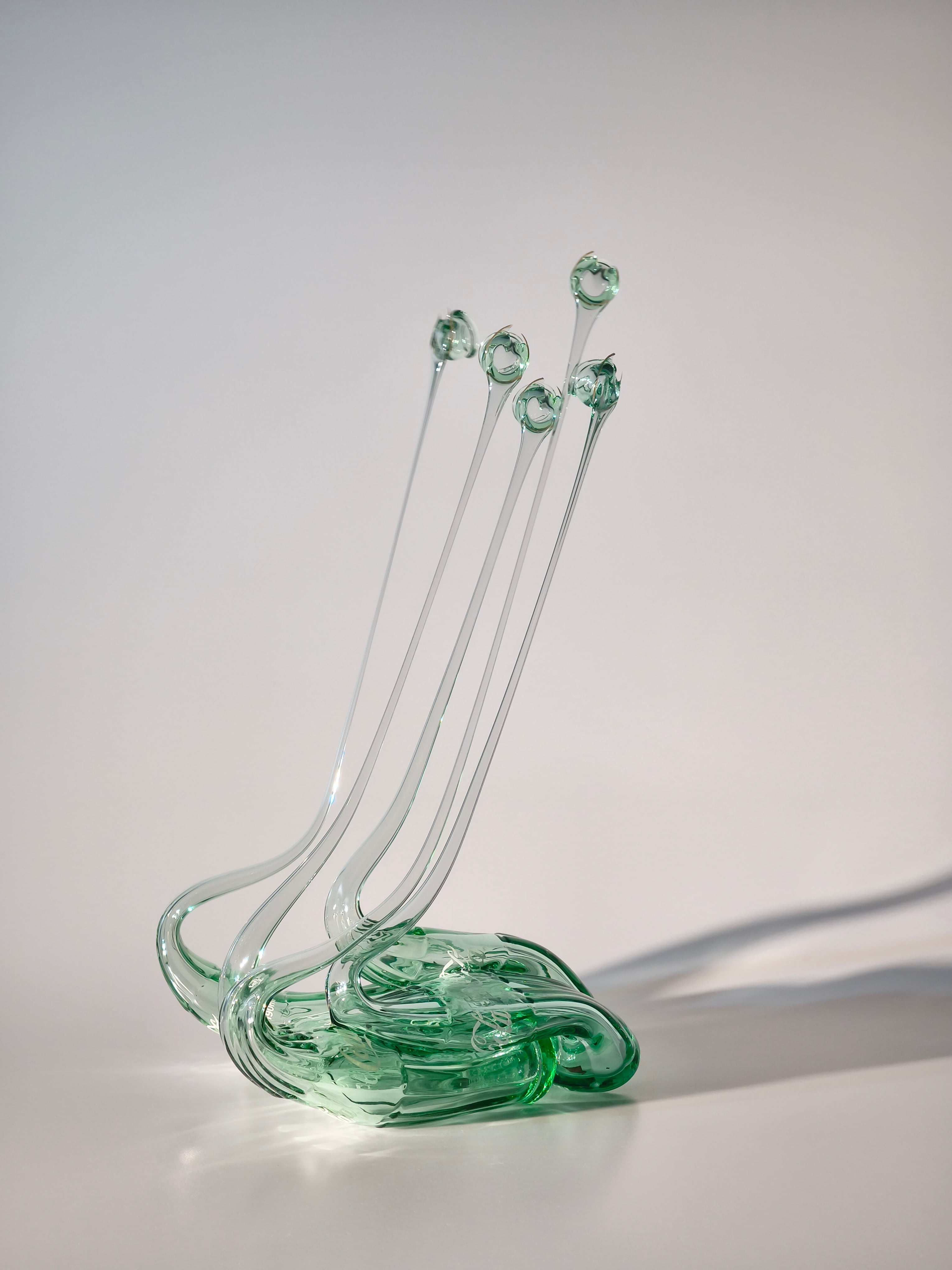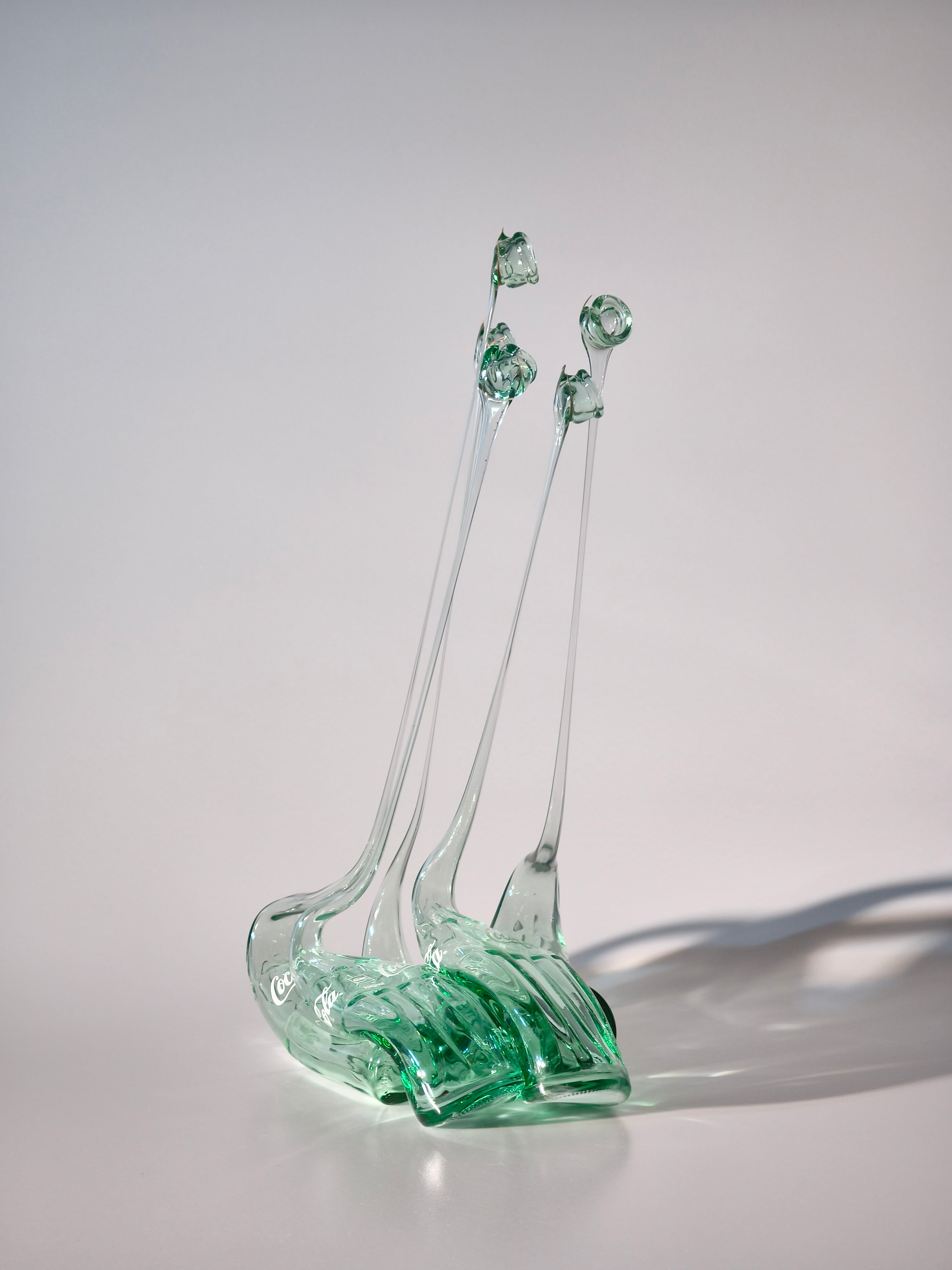 制作している作品は、大きく二つに分けられる。 ひとつは、複数本のガラス瓶が溶け合い、塊として形成される作品。 もうひとつは、ガラス瓶の首が引き伸ばされ、変形していく作品である。