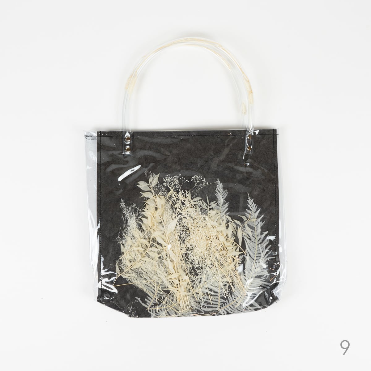 ビニールバッグの中に様々なカラーのドライフラワーをそのまま封じ込んだPVCビニールトートバック。